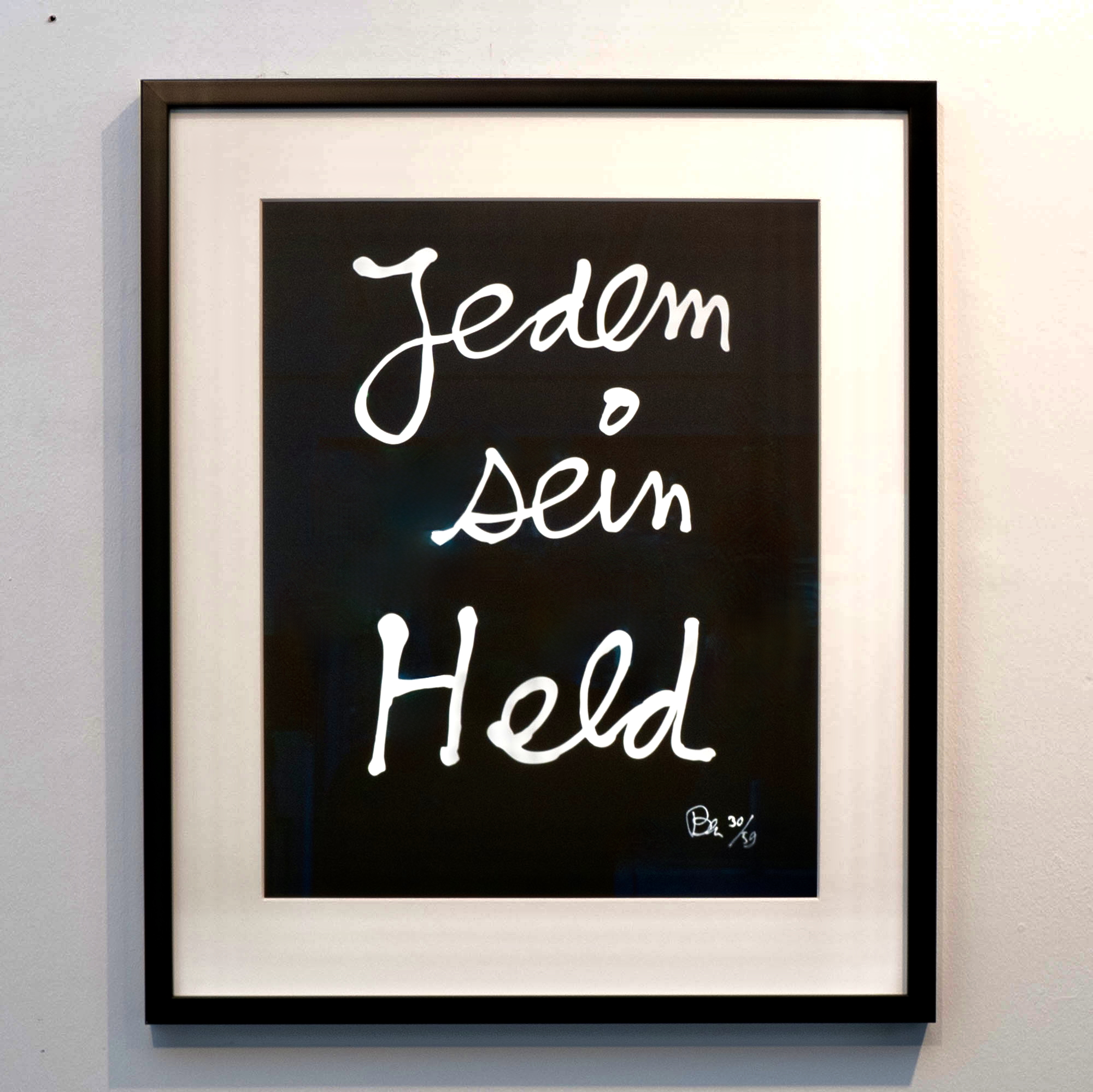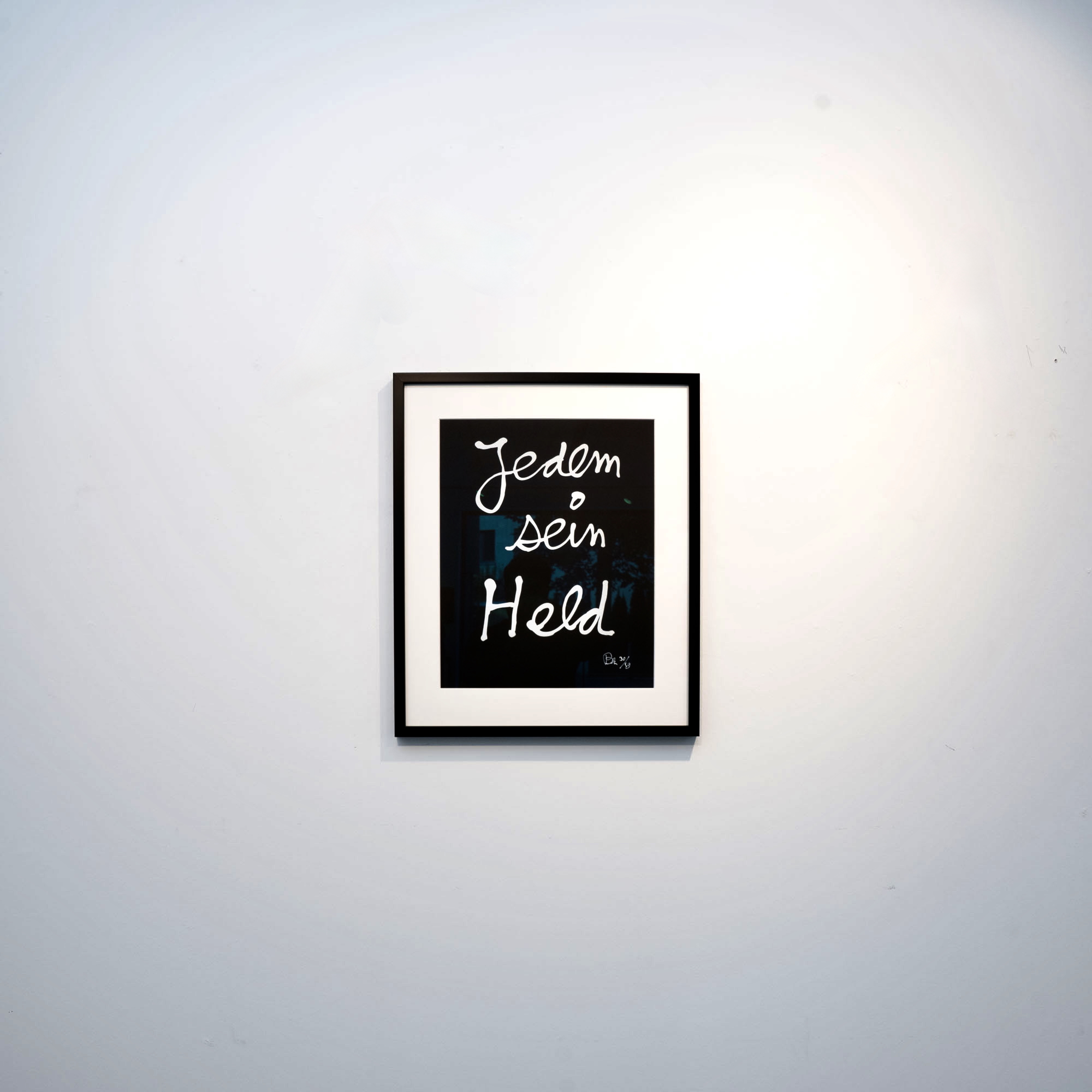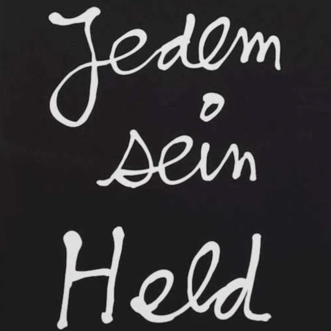 Mit der einfachen, aber vieldeutigen Aussage „Jedem sein Held“ spielt Vautier mit gesellschaftlichen Idealen und individuellen Vorstellungen von Größe.