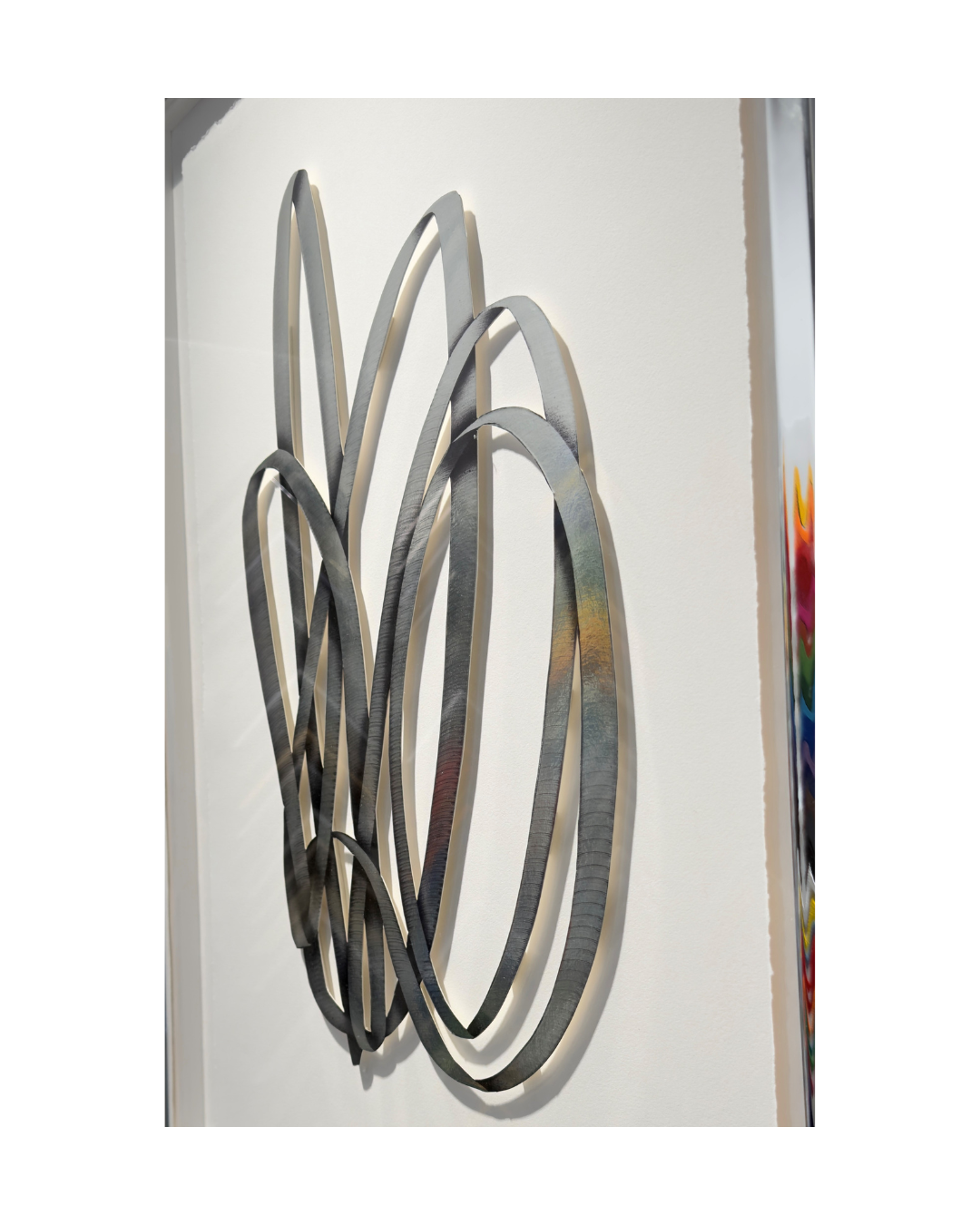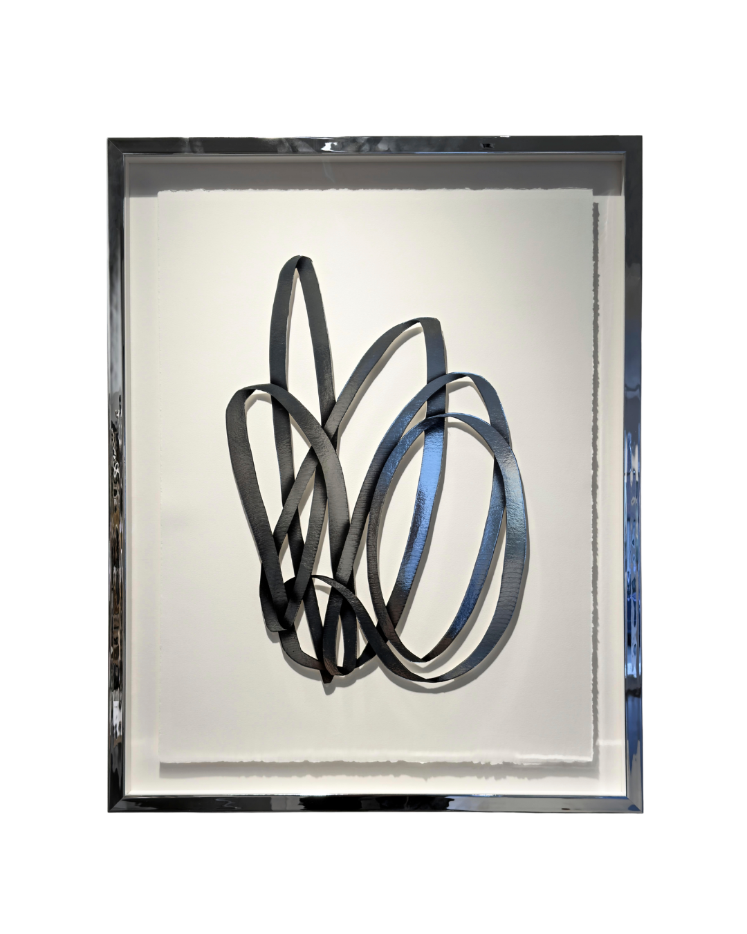 Die aus dem Papier gelösten Formen treten leicht aus der Oberfläche hervor und erzeugen ein lebendiges Zusammenspiel von Licht, Schatten und Reflexion. Je nach Blickwinkel verändert sich die Wahrnehmung der Arbeit und lässt die Komposition räumlich wirken.